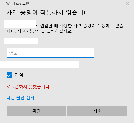 연결할 때 사용한 자격 증명이 작동하지 않습니다. 새 자격 증명을 입력하십시오.
